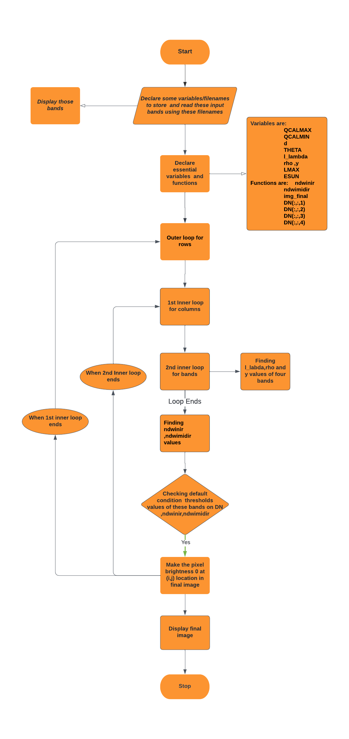 The near infrared band (0.75-0.9) in which most of the pixels with water bodies appear darker as their DN values lie in between 10 to 40. This property helps in delineation of water bodies in MATLAB.